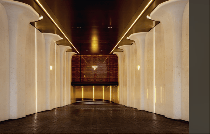 门庭延街的外立面,以精工定制弧形米色石材为主调,镶嵌典藏级老虎玉大理石,点缀古铜色现代海派艺术感灯器,整体呈现出百年海派的贵雅气质。