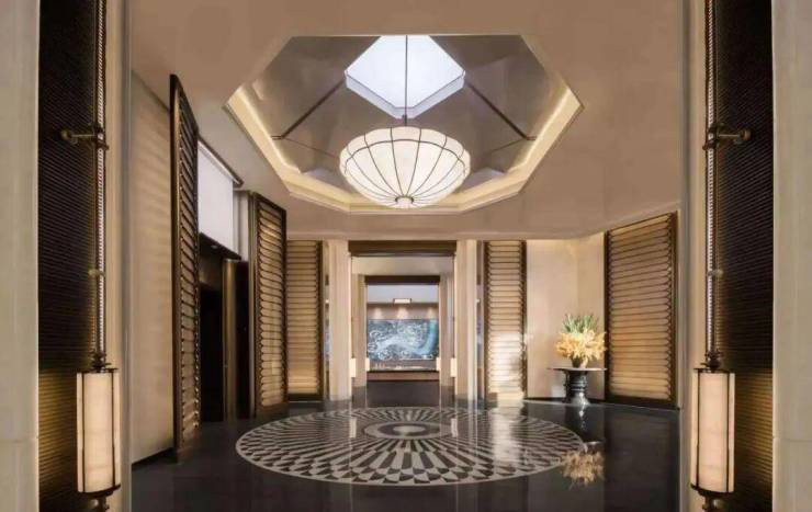 目前已呈现的望潮洋房地块主大门长约50米、高约10米,把庑殿金顶、斗拱转译,结合宝格丽金奢石等,不仅造型灵动飘逸,且极具东方气派。