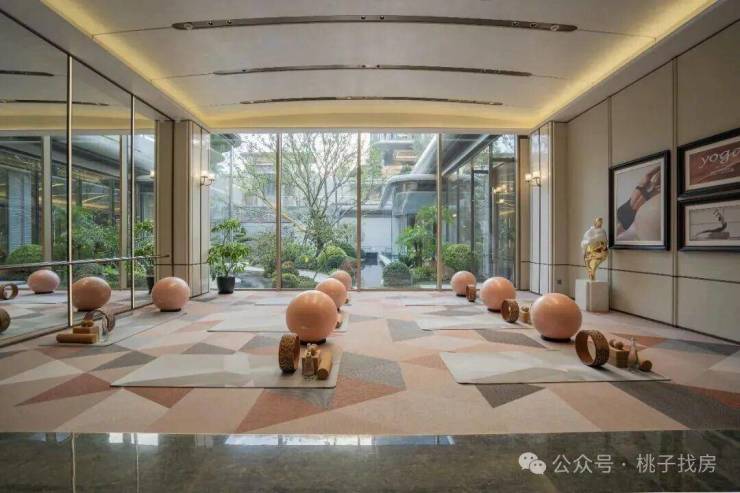 公区配置功能区非常丰富,恒温泳池、景观水系、瑜伽室、健身房、水吧……都是围绕下沉式庭院打造的,虽然整体占地面积不大,但是因为架空,层次感很足,一圈走下来,老费劲了。