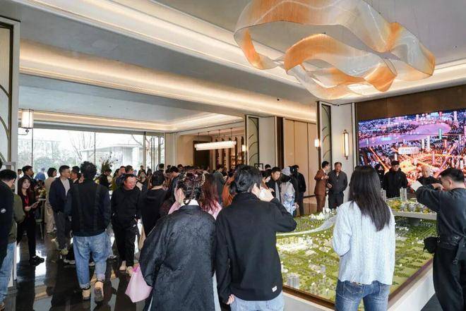 售楼处门口大排长龙;里面客户坐满了现场;
