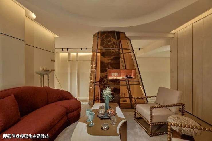 更加别具一格的设计在上方的负一层创意临展空间,透明的茶色玻璃壁炉贯穿于此,金属镶边与定制家具相应和,与华丽红沙发一道,应和着海派Art Deco风情,延展出融合历史与文化格调的能量回旋。
