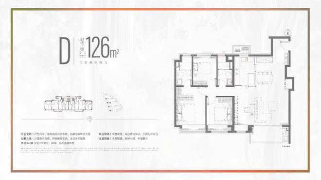 126㎡四房:6.8米横厅+双阳台,得房率90%。