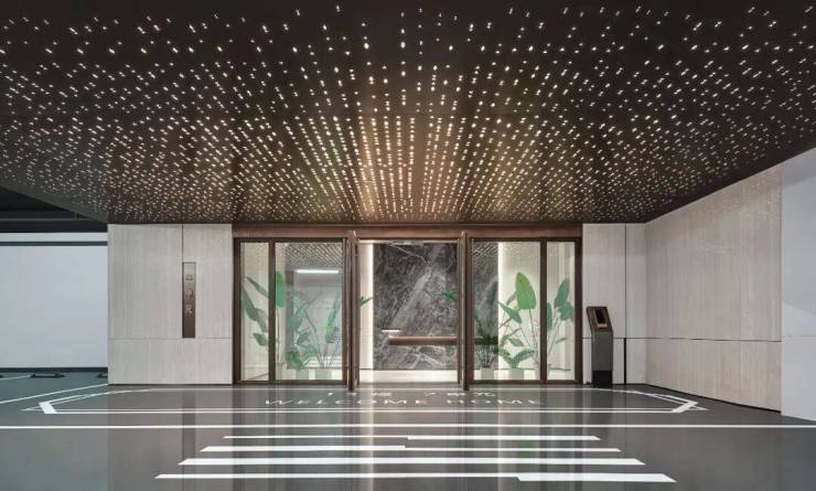 以灰色为主调的前行车道,简约大气;驶入内外过渡的中车马厅落客区,顶部金咖铝板定制切割的星空顶以万千盏繁星光彩配合细腻的灯光渲染,营造出星河璀璨的归家体验,这种自上而下的流动质感,让身心在视觉盛宴中都沉静下来。