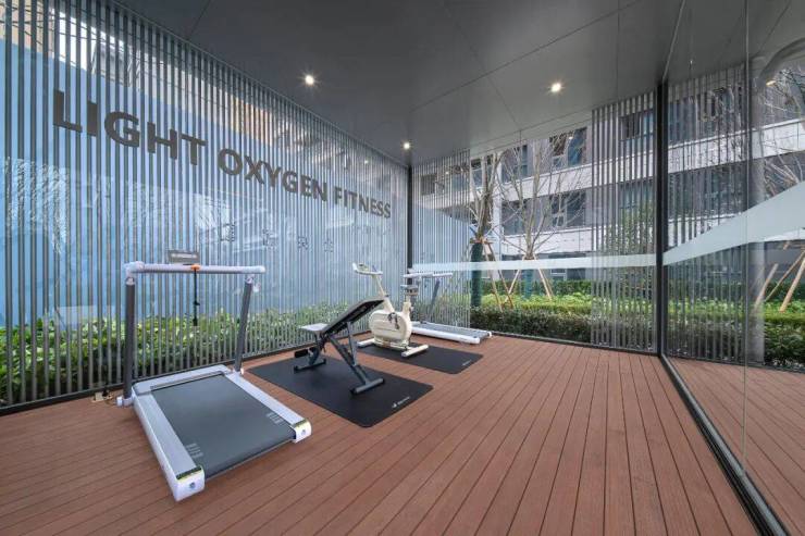 难得的是,被林荫、芳香所环绕之处还有一座“健身仓”。整体由落地玻璃围合而成,隔而不离的创新设计让运动与赏景巧妙相融,开阔的景观视野模糊了场景之间的边界感,让“度假感”充满每一个角落。