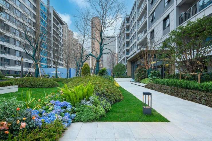 矮墙搭配常绿植物、度假风花境,围合出院落式的入口空间,将社区共享空间、单元入户空间及室内入户大堂,营造出中式院落独有的三进式礼序。
