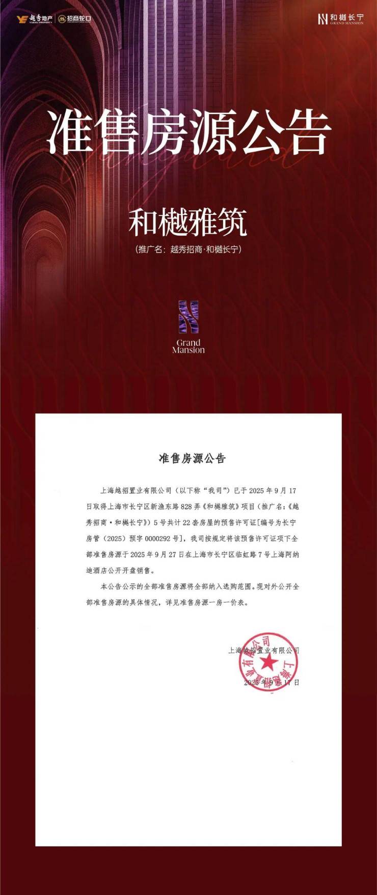 本宣传资料属于要约邀请,不作为要约或承诺,资料中对项目周边环境、交通/公共设施、政府规划、商业配套、教育资源、发展/投资前景、区位等的展示或介绍,旨在提供相关信息供参考,开发商对此不做任何承诺,相关宣传内容不排除因政府相关规划,规定及开发商未能控制的原因而发生变化。买卖双方的权利义务,以最终订立的《商品房买卖合同》及附件等协议约定为准,本项目备案名为【和樾雅筑】,开发商为【上海越招置业有限公司】,预售证号:长宁房管(2025)预字0000292号,本资料发布时间为【2025】年【9】月,有效期为[3]个月。