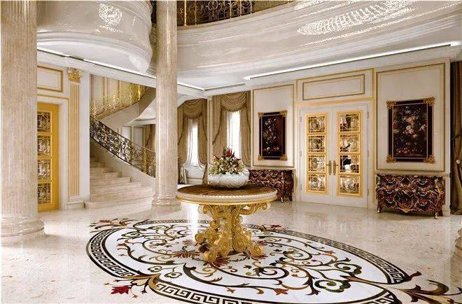 入户门厅比普通豪宅的客厅还要大,两根罗马立柱让这个空间满满都是仪式感。