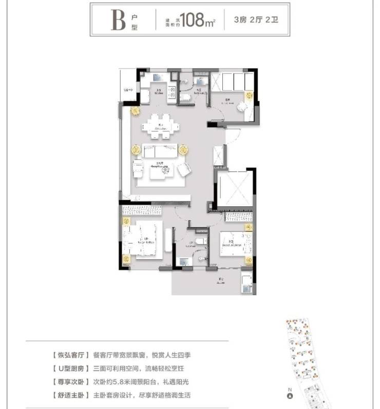 建面约108㎡户型就略带一些改善的意味了。高端项目常见的大边厅,营造了客厅、餐厅、厨房开放打通的“LDK一体化”模式,使空间感更加通透。U形厨房让动线更加流畅顺滑,尺度感甚至可以和市场上一些改善产品不相上下。