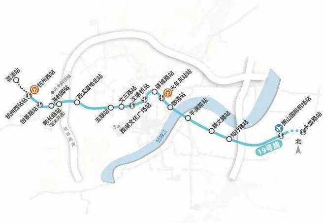 机场快线19号线:直距约870米火车西站站,始于苕溪站,通向萧山机场方向永盛站,从杭州西站到东站仅需30分钟,到萧山机场仅需45分钟。