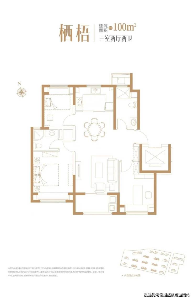 建面约100㎡户型3室2厅2卫▼