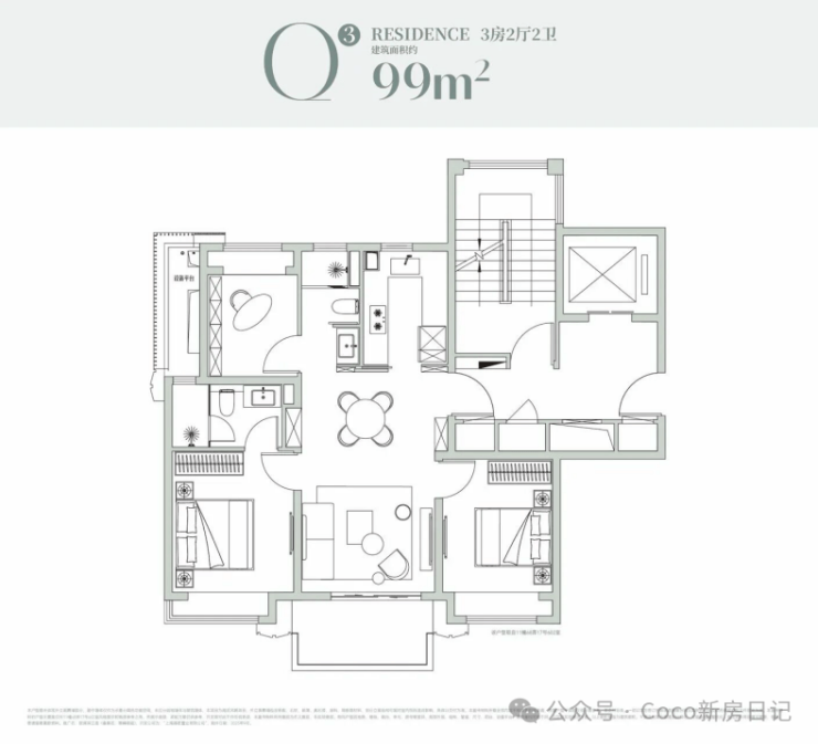 厨房、餐客厅、阳台形成直线通风廊道,南向三开间+宽尺客餐厅,轻松容纳二胎三代家庭的日常;
