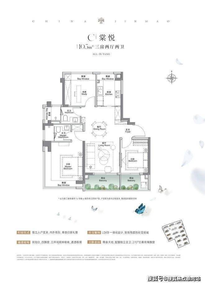 上海宝山金茂棠前营销中心热线4008818994(官方预约热线)建面约105㎡3房2厅2卫,做到了三开间朝南4个飘窗+双面阳台系统+主卧套房设计+270°转角飘窗,该户型的居住体验、舒适度、尺度感,是同级别产品所无法比拟的。