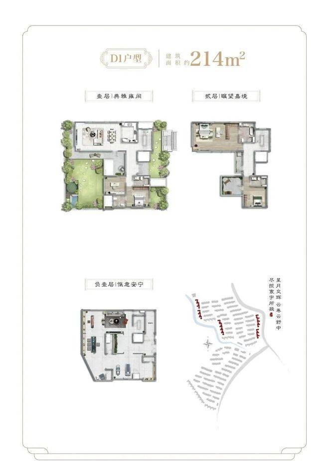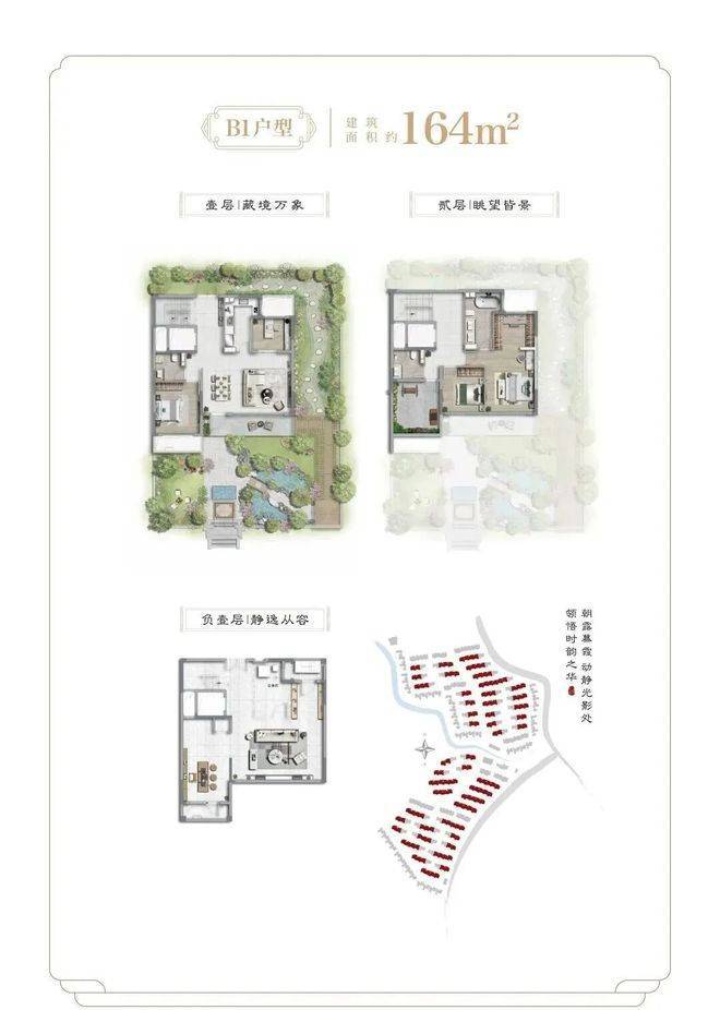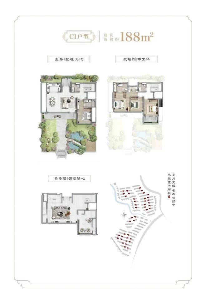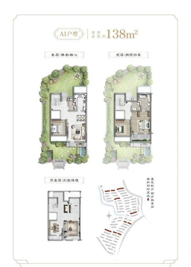 项目二期为纯别墅产品,社区容积率约0.41,面积段约为138-455㎡之间不等,不仅延续了一期多重景观结构,出市入室的仪式感满满,更是提升为围合式院落结构,增加了转角街巷之间的景观点,细节之处尽显大宅风范和业主的雍容气度。除常规的有天有地之外,还配有超高层高地下室及露台。