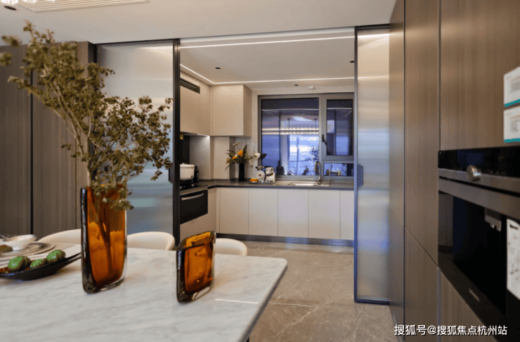 厨房方面,惊喜满满,U型台面设计,大幅提升操作空间,厨电配置了方太烟灶——注意,市面上常见的高端厨电配置,一般是油烟机+凉霸,但中建山水雅境采用的这款方太油烟机, 是将油烟机和空调合二为一,保证最大化吸收油烟的同时,还可以显著降低温度。