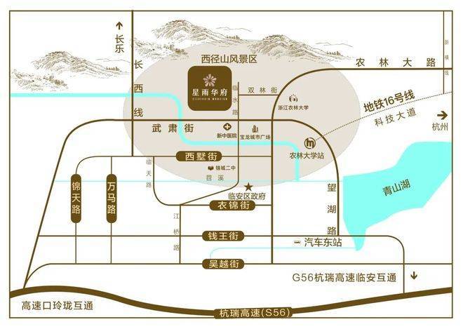 雨润星雨华府售楼处营销中心:400-8828-814雨润星雨华府售楼处电话/地址☎:400-882-8814(开发商热线)临安雨润·星雨华府, 位于杭州市临安区锦北板块,背依西径山脉,得天独厚自然景观资源,直线距离农林大学东湖校区约400米、宝龙商业广场约900米,3公里内地铁16号线农林大学站、锦城二中、新中医院等医、食、住、行、学配套醇熟,繁华与自然兼得。