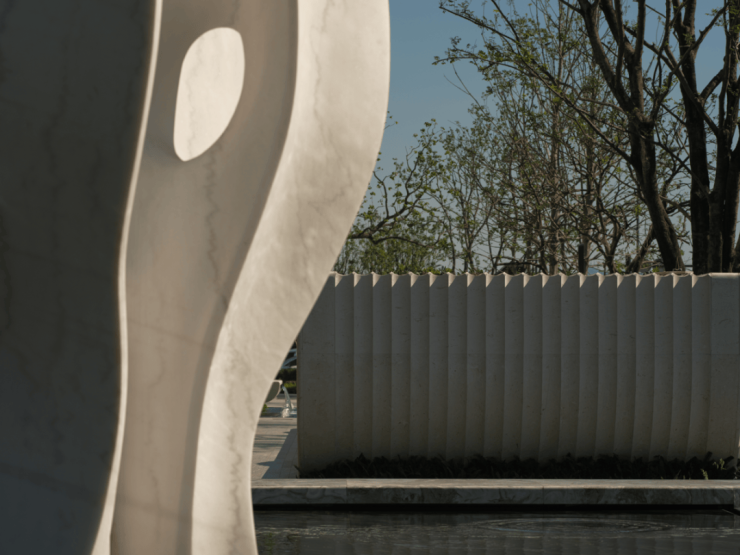 入口水景,是一件关于西溪记忆的“现代艺术品”。我们并未直接搬运西溪的船,而是将“摇橹船”的流线形态进行抽象提纯,化作水景端头的雕塑化表达。为了强化仪式感,水景标高被微妙降低,形成一种“谦逊”的姿态。池底铺陈异形定制的“碧潭金沙”石材,池檐则选用冷冽的“安第斯雪景”花岗岩。