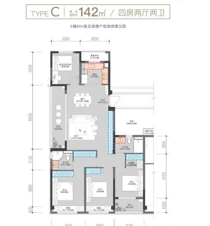 建面约142㎡改善大四房,采用大尺度边厅设计,进一步放大了阳光平权的优势;270°环景视野,提升居家无界的生活质感; 南向三卧室+约6.6米边厅观景大阳台,与客餐厅无缝对接,让家人在餐饮娱乐之余,观赏窗外美景,尽揽四季风景。