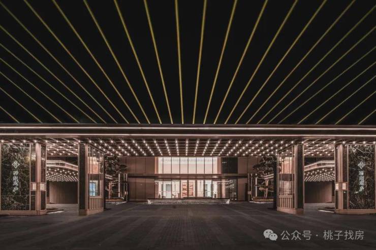 墨绿色的奢石景墙沿着两边对称排开,嵌上了粗细有致的金属线条做分割,底部是人字形纹路的铝板做拼接,到了夜晚,还能看到头顶的「满目星光」。