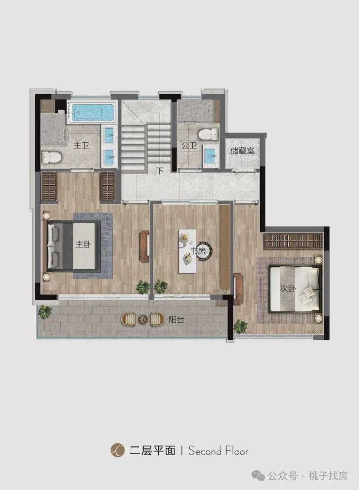 二层空间同样打造了约7.2米长阳台,二层设置了一个豪华套房主卧,以及一个次卧、一个书房以及公卫连通开间约4.2米的主卧与开放式书房,即使起居在二层,南向外接宽境阳台,可以眺望小区的园林美景。