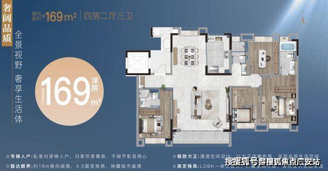 洋房(6-8层):建面约140㎡(四室两厅两卫,得房率85%)、169-187㎡(四室两厅三卫),南向面宽达13.2米,配备6.6米宽景阳台及主卧套房
