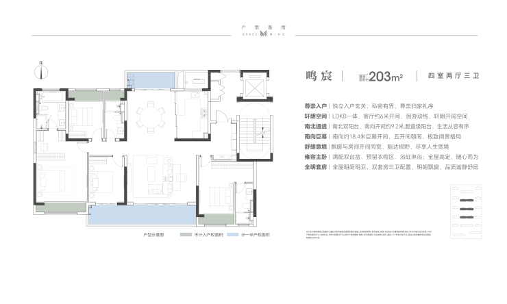 建面约170/203㎡户型,四室格局,南北通透;南向大面宽,双联景观阳台,成就郎阔空间尺度,尽揽清风与阳光;独立入户玄关,私密有界;飘窗与房间开间同宽,尽揽阔绰视野;主卧套房设计,独享天地,自成静界.