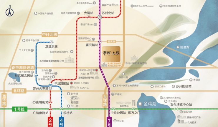 项目位于大湖西CID板块,紧邻地铁7号线富元路站(在建,2026年通车),15分钟车程可达苏州中心,3条高架(东环北延、春申湖快速路、中环北线)形成立体交通枢纽45。阳澄湖星济隧道(2027年通车)将实现10分钟直达园区湖西CBD5。