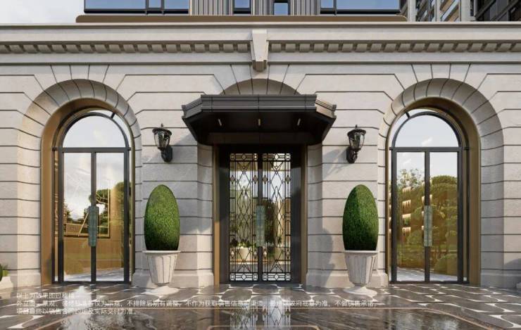 建筑立面通过明确的基座、主体与檐部层次,再现了经典新古典主义的庄重比例。