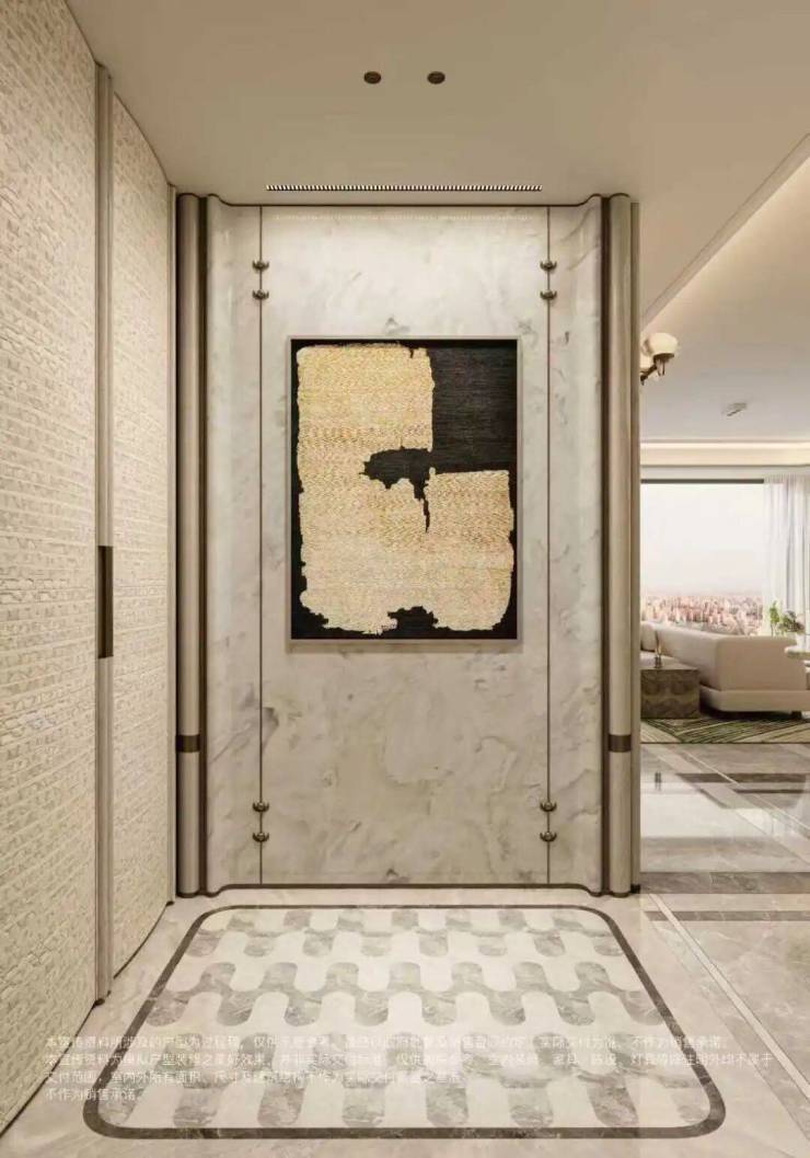 约2㎡玄关拼花采用胜利拱券×全水刀工艺!超高压切割让石材切口平整无崩边,结构更稳定,搭配天然石材的高硬度属性,长久使用依旧光洁如新,省去后期维护烦恼。