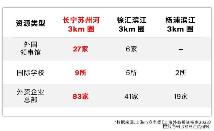 据上海市商务委《上海外商投资指南2023》数据显示,长宁涉外资源密度是徐汇滨江的2-3倍、杨浦滨江的4-10倍,是能够支撑国际客群支付溢价的!