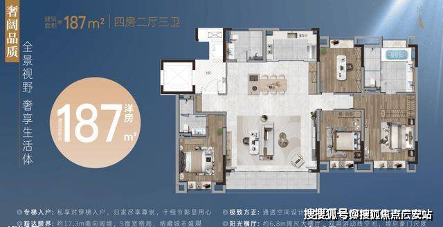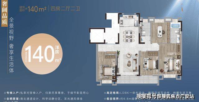 洋房(6-8层):建面约140㎡(四室两厅两卫,得房率85%)、169-187㎡(四室两厅三卫),南向面宽达13.2米,配备6.6米宽景阳台及主卧套房