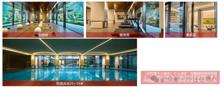 项目会所约1600㎡, 内部配置室内25×10米的恒温泳池、水吧书吧联动区、瑜伽房、健身房、儿童空间、棋牌室等功能区。(如下图展示)