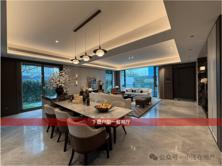 🔺布局方正且空间尺度舒适:中叠地上部分为五房五卫格局,边套主卧面宽达11.6米,餐客厅面积超60㎡,单层使用面积达110㎡。
