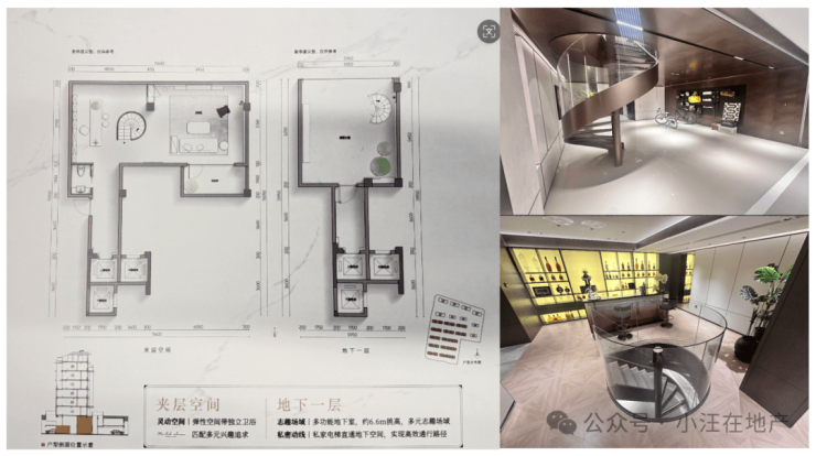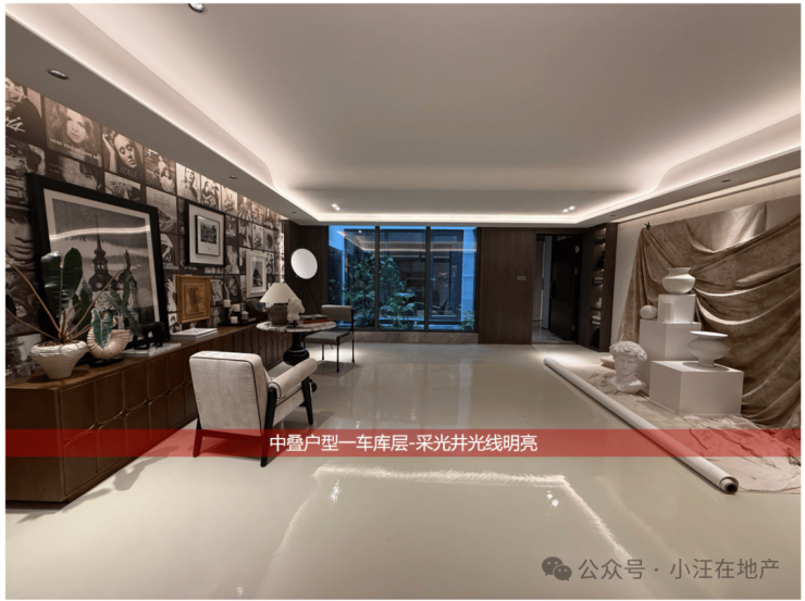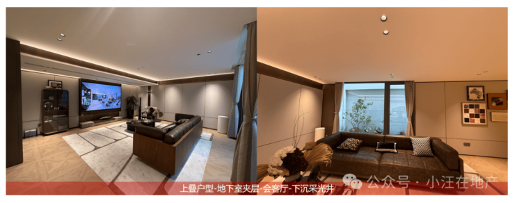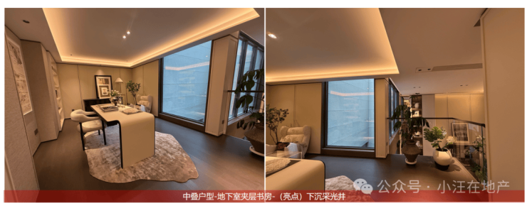 下叠地下室层高约6.6米(3.5米夹层+约3.1米地下层),总面积超约200㎡,样板房挑空设计,通过夹层下采下沉庭院采光,保证了地下空间的明亮和通风干燥。