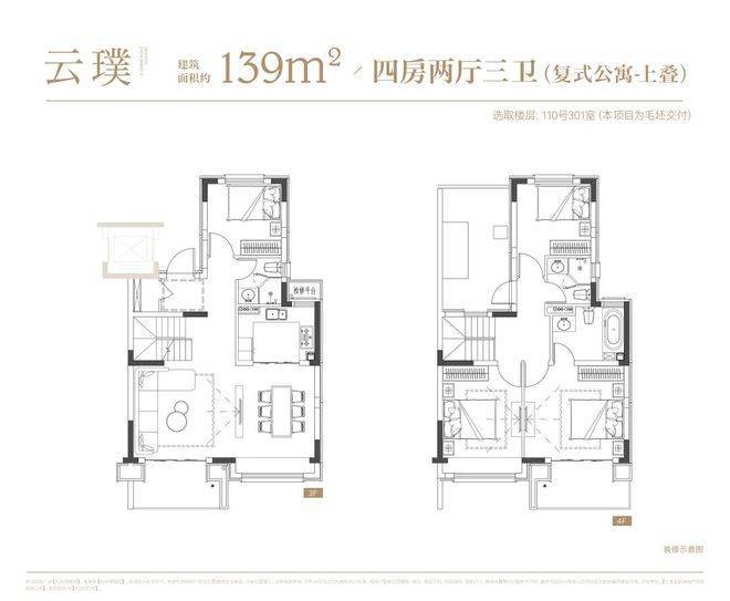 叠墅:叠墅一共四层,分为上/下叠,上叠建筑面积约139㎡,下叠建筑面积约142㎡。