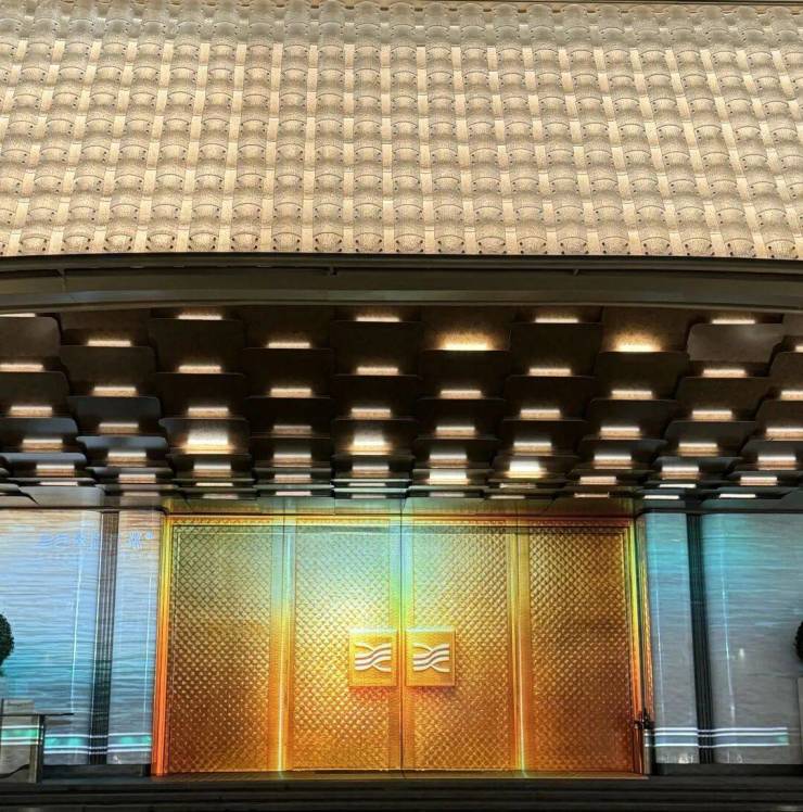 你看社区大门宽约46米,高约9米,灵感源自“京杭大运河博物馆”设计,顶部大约2280块水晶瓦精心雕琢,内部超300块金鳞铝板手工拼接,还有层叠水景,整个一看就贵气。