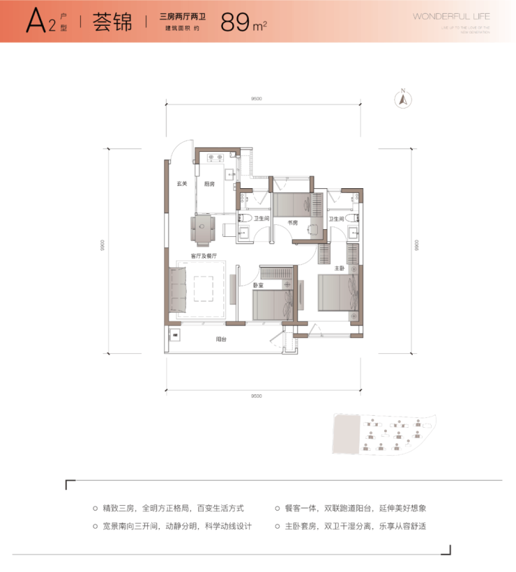 项目主力户型建面约89m²3房2厅2卫,近10米南向面宽,约6.3米的超大阳台打造更舒适的空间尺度感