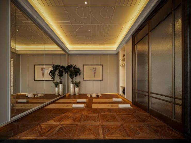 轻法式风格高定瑜伽室,镜面雕刻暗藏巧思,以现代化手法演绎ARTDECO图形元素,延续健身空间美学。