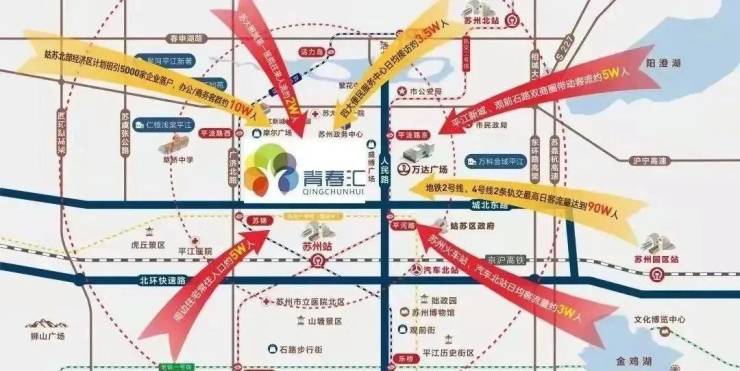 人民路在侧,苏州站和汽车北站双枢纽加持。更有三条地铁紧邻, 项目距离轨交2号线平河路站步行约2分钟,4号线苏锦站约4分钟、紧邻项目的6号线正在建设,直达或转乘,轻松到达全城各处,早晚高峰绝佳出行方式。 2条轨交最高日客流量更达90万人次。铁路人潮加持,为商业综合体提供澎湃活力。