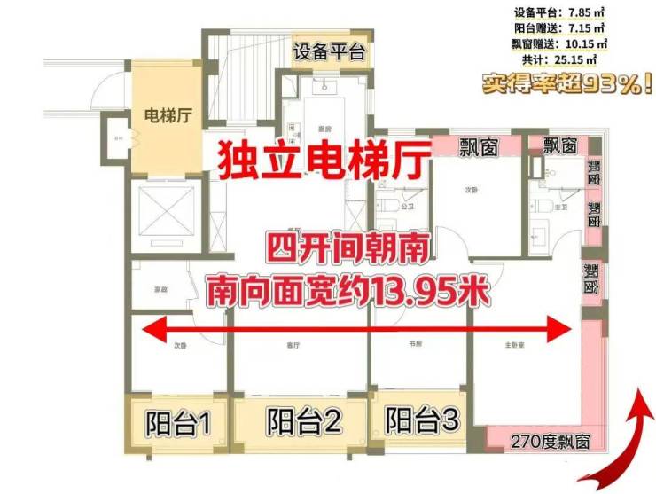 类一梯一户的独立电梯厅+约13.95米南向大面宽+三阳台和设备平台的超高实得率+270度全景舱视野+超高效收纳,实得率超93%!