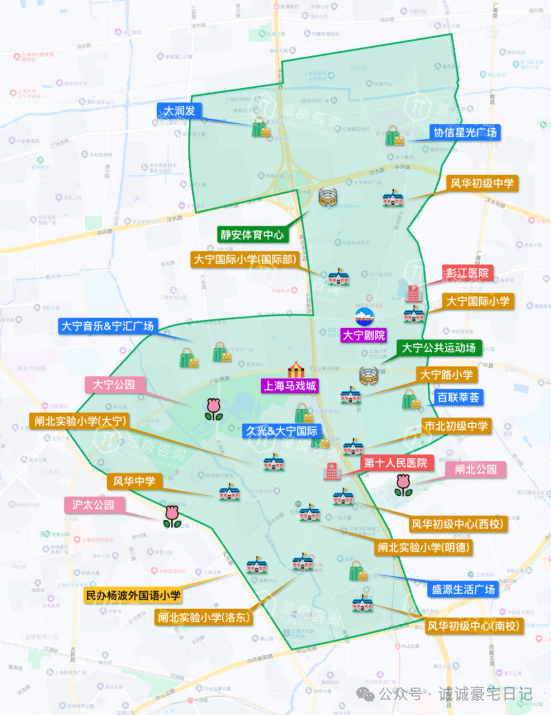 在原来的老闸北工业厂房拆迁后,大宁其实是从成片的空地整体规划开发,所以大家可以看到,这个区域是一个由中产豪宅+学区+交通+密集生活配套组成的强区。