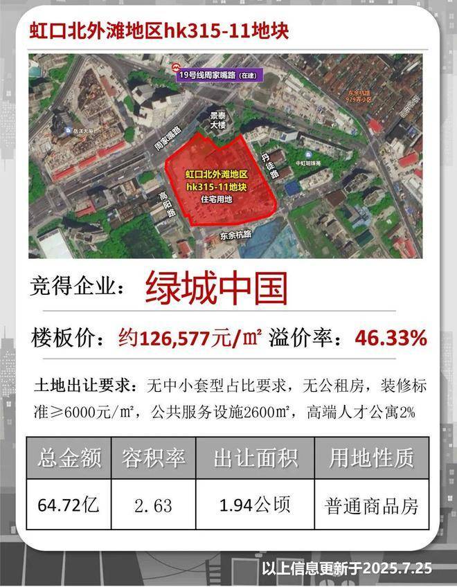 25年7月,上海第六批次土拍中,绿城以总价647190万元竞得虹口北外滩地块,溢价率46.33%,楼板价126577元/㎡,装修标准6000元/㎡,创下近年来土拍最高溢价率。
