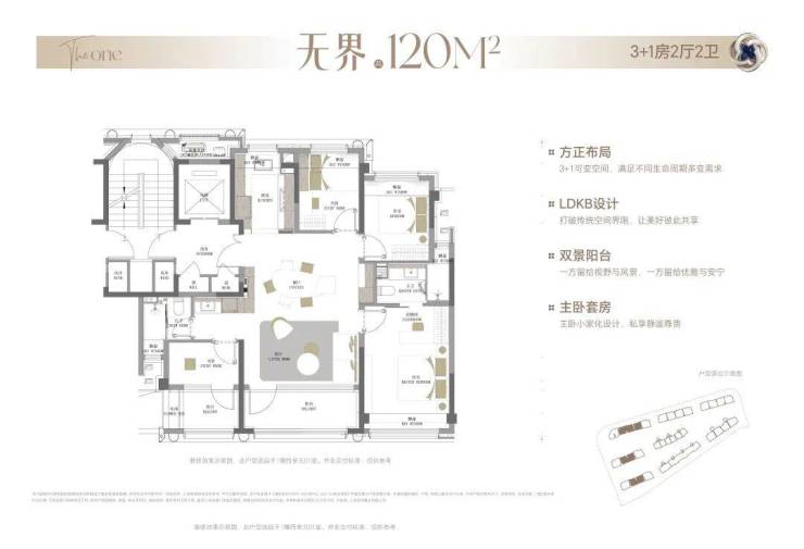 换句话说,项目在120+㎡里,通过极致的设计,做出了别人140㎡才能实现的功能空间,且实际可利用面积率接近90%+(含飘窗、阳台等)。