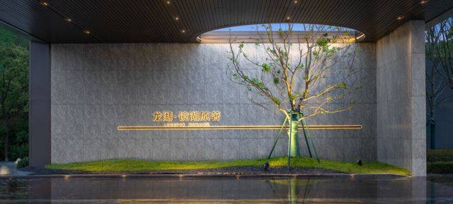 归家动线上,采用高端酒店的设计手法,打造了约28m宽、约5m高的超奢华入口展示面,考究和精致的景观设计,在此还自然于镜湖。