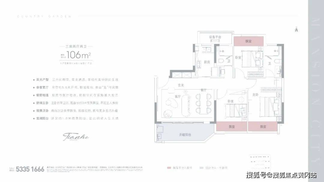 三开间全明设计,约106㎡户型客厅开间竟然达到约5.6米,配备约1.8米进深揽景阳台、多室飘窗设计,让视野角度更为开阔,享受阳光与绿意交融的生活,欢聚与分享的美好时光,多种情境随意切换。