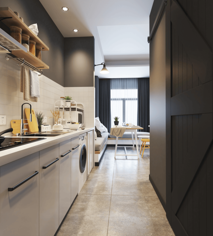 一层入户后右手边就是独立卫生间,卫生间带淋浴房、马桶和单独的洗漱台,且尺寸面积比较不错;左手边往里面就是厨房,洗切炒功能区也一应俱全,还有双人餐桌,另外就是起居室和书房的独立空间,起居室放置1.8m的大床绰绰有余,书房区域可以改为休闲区,平时招待三两好友,不愁没地儿坐。