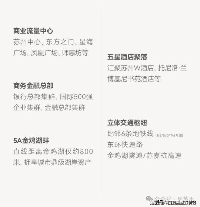 出门即是顶级配套:逛苏州中心、东方之门,去星海体育馆运动,到文化博览中心看展,孩子就读星海小学、星海实验中学,家人健康有九龙医院守护。交通更是四通八达:东环快速路、金鸡湖隧道就在旁,地铁1号线、3号线双轨交汇,快速接驳苏嘉杭高速,一小时生活圈畅达虹桥、硕放机场。最难得的是,项目距5A景区金鸡湖直线仅约800米,将自然湖景与都市繁华同时拥入怀中,成就了不可多得的湖景大平层生活。