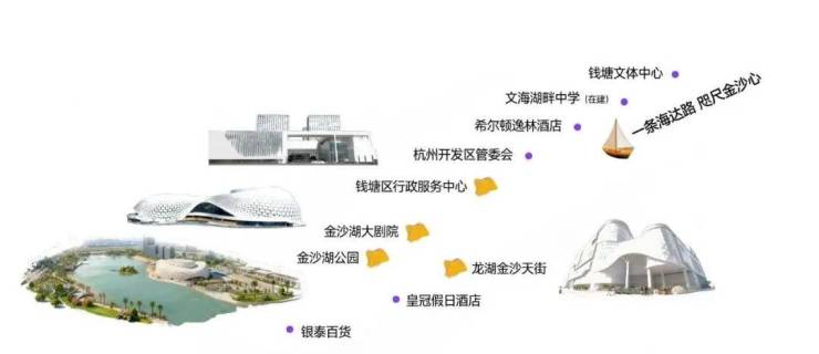 也不仅仅是金沙湖,沿着海达路驱车出行约2公里,你还能看到整个金沙湖CBD的精华:钱塘图书馆、钱塘问题中心、希尔顿酒店、金沙天街、金沙大剧院、银泰百货等都陈列在这条道上。