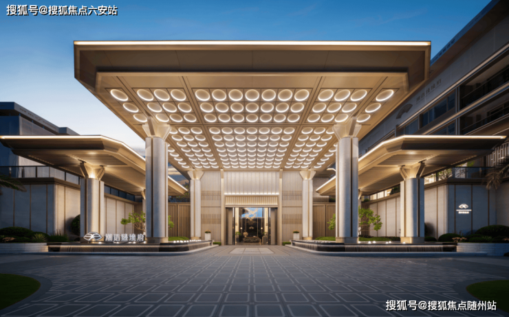 约30米超宽门庭、9米挑高穹顶、四根罗马柱及镜面水景,塑造高奢酒店式归家礼序。建筑立面以铝板与玻璃幕墙为主,实现公建化立面迭代,重塑城市天际线美学。