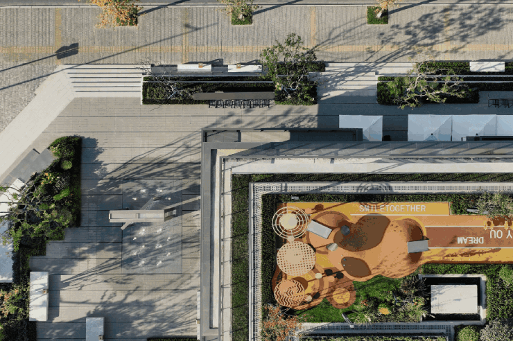 进入社区内部,第二级台地构成园区主要活动场所。约120m²的宠物乐园设有基础活动设施,供住户日常遛宠;相邻是超过300m²的全龄儿童活动区,分区设置适合不同年龄段的游戏器械;中央约400m²的户外会客厅设有遮阳座椅,供居民休息、邻里交谈。