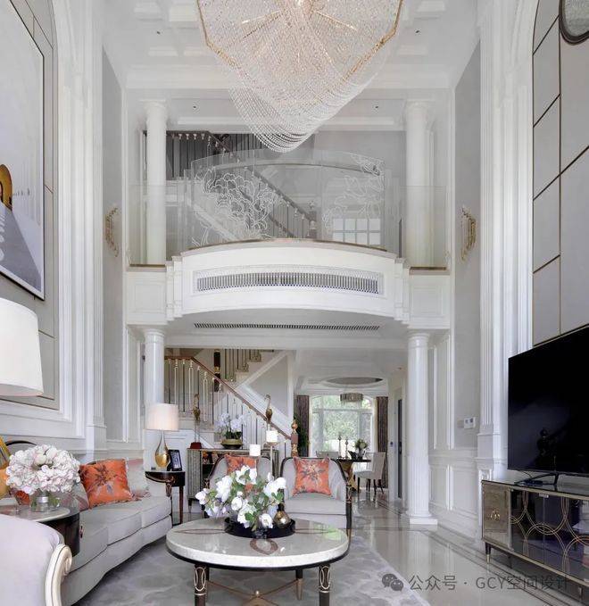 挑高的双层格局,搭配白色罗马柱和弧形结构,营造出大气庄重的空间感,楼梯区域的玻璃雕花护栏增添了精致细节。以白色为主色调,搭配大理石地面、金属质感的家具配饰,材质组合尽显轻奢优雅;软装中橙色抱枕与白色花卉形成色彩对比,丰富视觉层次。大型水晶吊灯提升奢华感,复古风格的家具、艺术挂画和花艺陈设,处处体现法式风格对浪漫与精致的追求,整体氛围既典雅高贵,又不失生活的温馨质感。